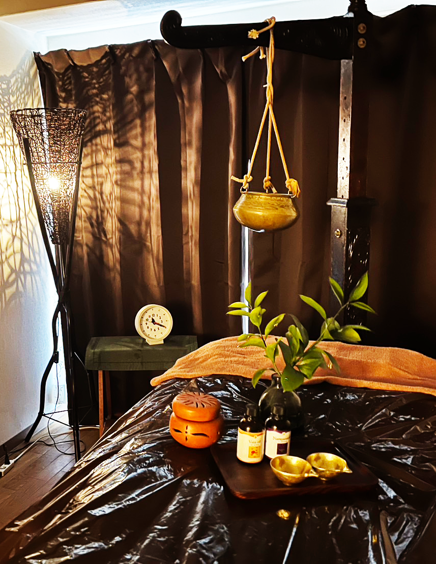 施術内容 | 全身アビヤンガ+バックマッサージ+カティヴァスティ |