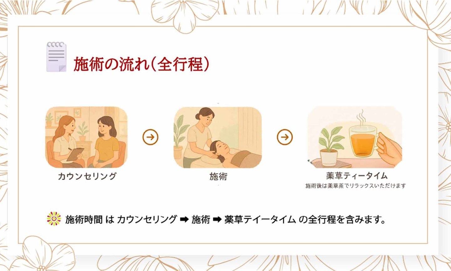 施術内容 | フットバス+ヘッド+フェイス+パウダーボディ+発汗(ヒートマット)+シャワー |